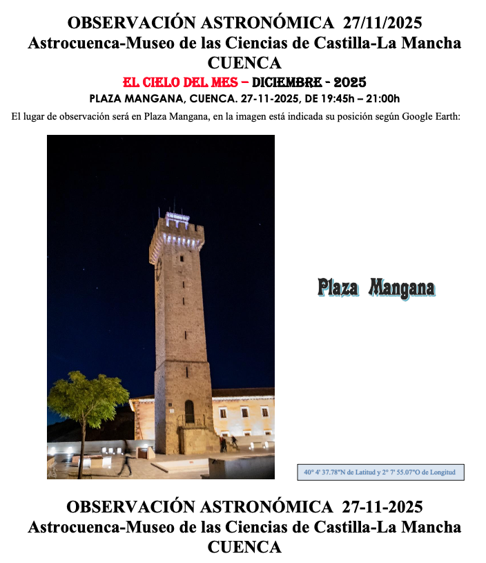 Este lunes 27 de octubre tendrá lugar una observación organizada y planificada por AstroCuenca de los cometas Lemmon y SWAN. La observación, en directo con telescopios y también con imágenes en vivo captadas por el telescopio del MUCMA y proyectadas en una pantalla grande, será en el Alto de La Tórdiga a partir de las 19:00 h.